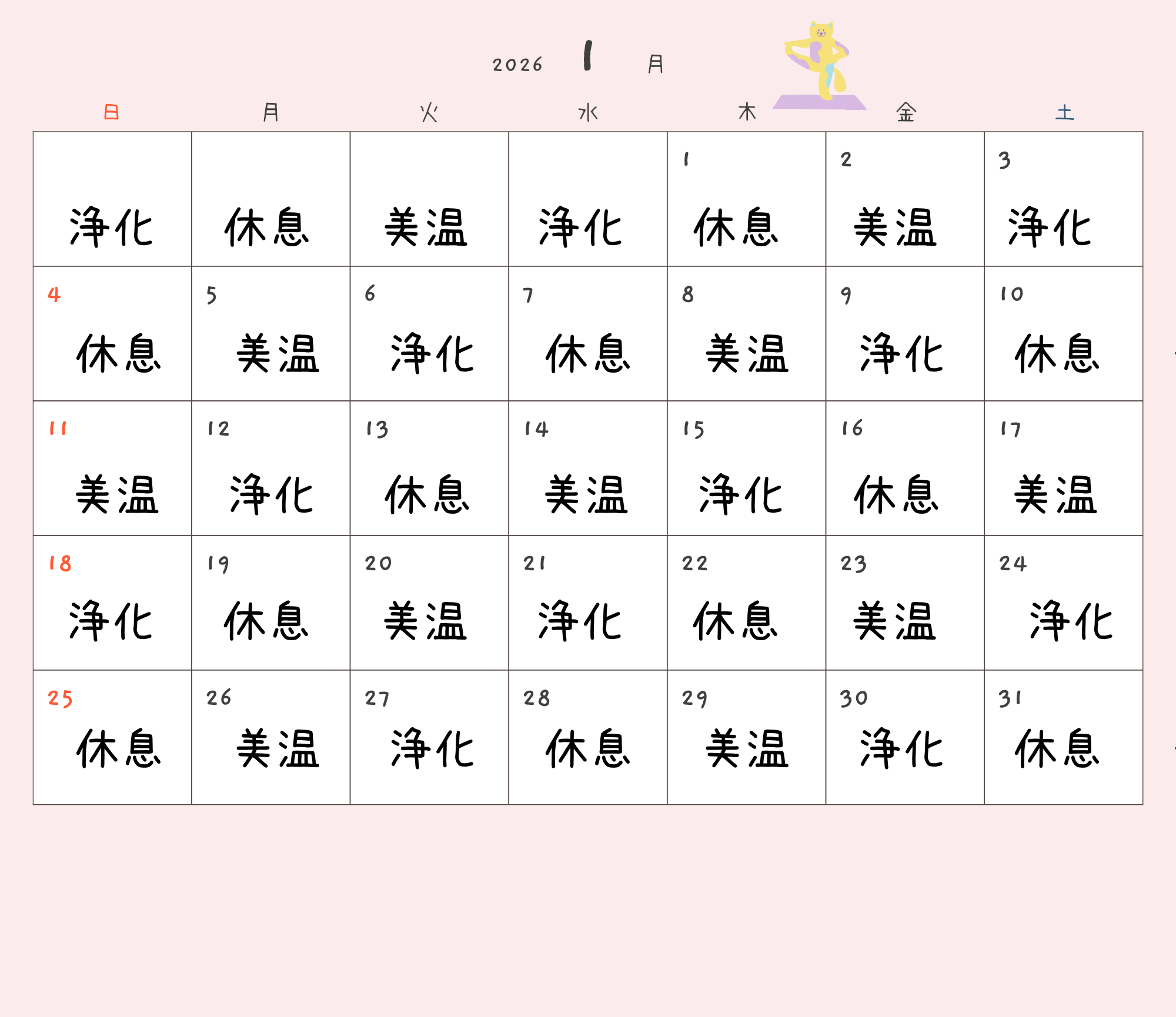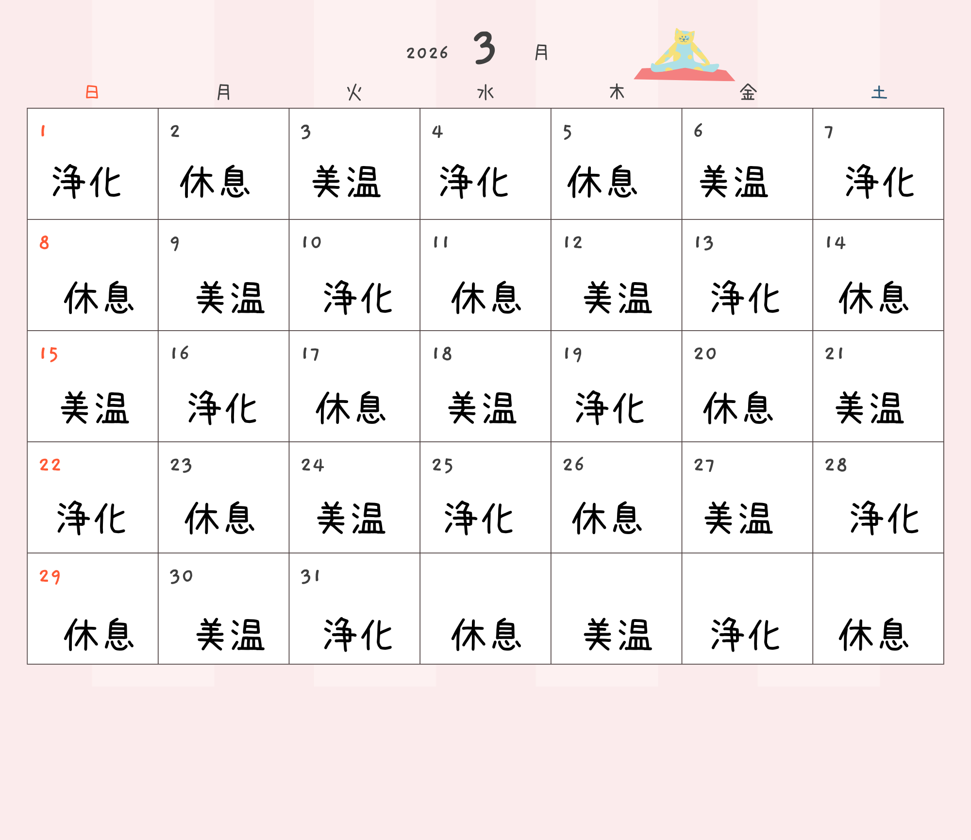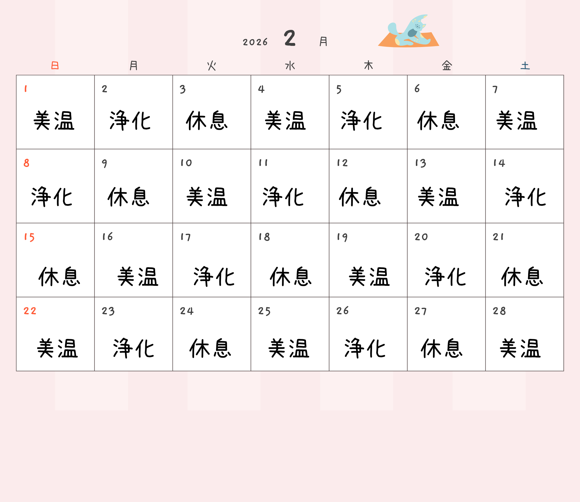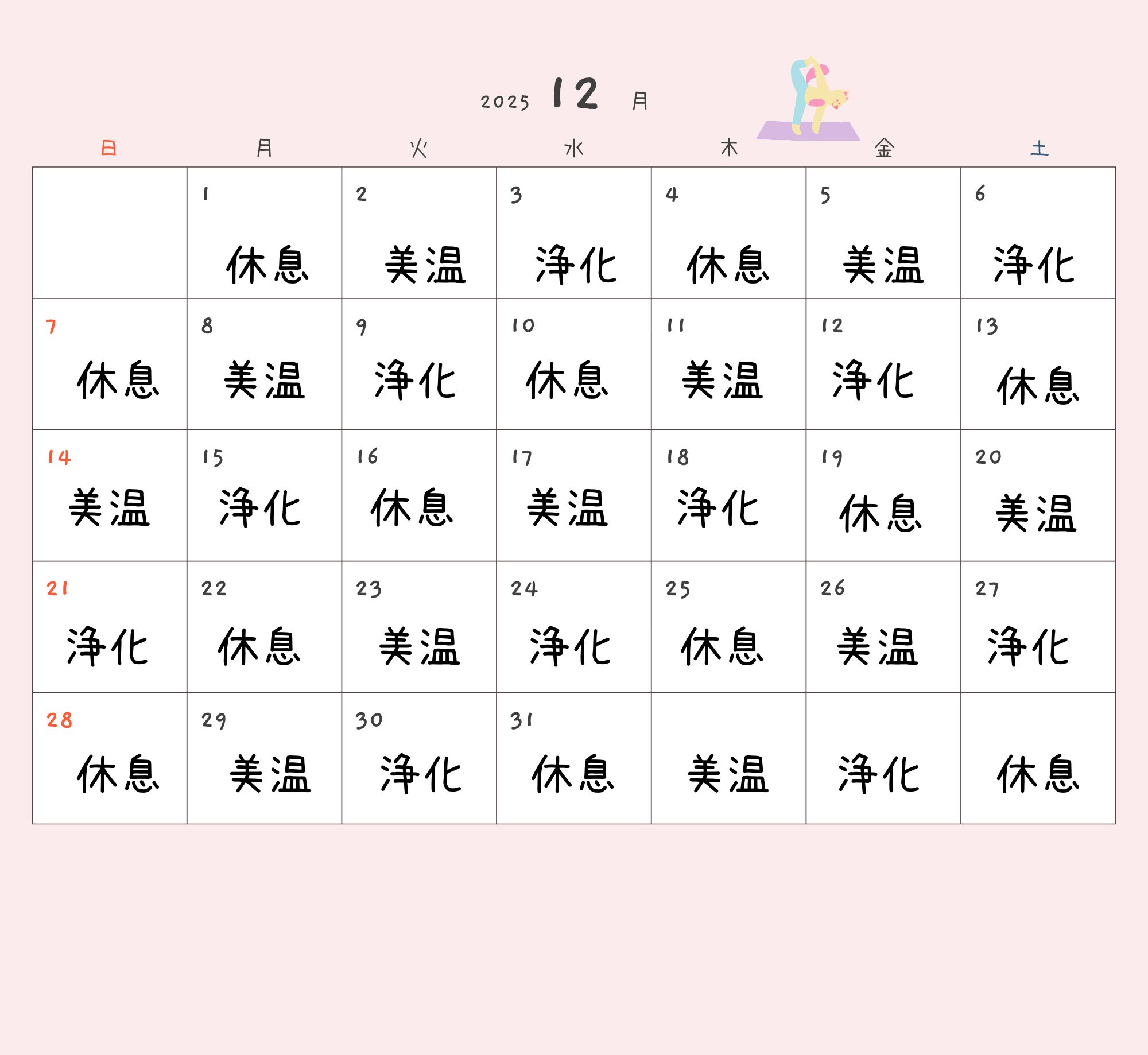 当店こだわりの詰まった3種類の効能別ハーブブレンドをご用意しております。下記カレンダーから症状別のハーブの曜日をご覧いただけます。 ハーブサウナは受けたその日の、夜から朝にかけて効力を発揮します。どのハーブでも言えることは睡眠、朝の目覚め、肌質です。目に見えない身体の内部にも重要な要素です。疲れを感じやすい、何をしてもうまくいかない、そんな時には心に余裕を作りにきてみてください。貴方の素敵な明日のために。美温ブレンド
